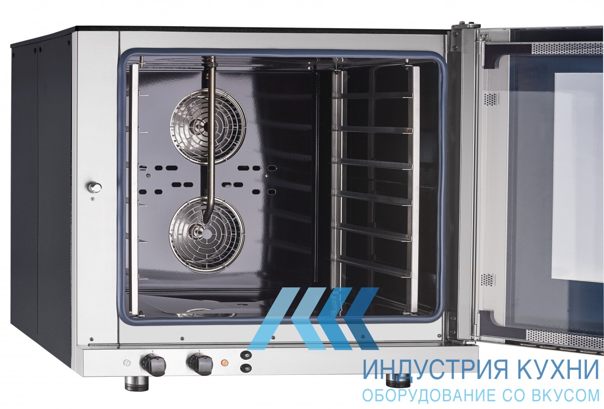Принцип работы печи в том, горячий воздух при помощи вентиляторов циркулирует по камере и прогревает и готовит блюда. Нагрев воздуха осуществляется двумя электрическими ТЭНами. До +240С печь нагревается за 8 минут. А функция увлажнения нужна, чтобы блюда не засыхали в процессе приготовления. Внутрь впрыскивается вода, которая при нагревании превращается в пар. Уровень влажности регулируется.