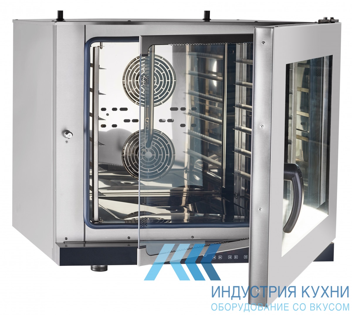 Принцип работы печи в том, горячий воздух при помощи вентиляторов циркулирует по камере и прогревает и готовит блюда. Нагрев воздуха осуществляется двумя электрическими ТЭНами. До +240С печь нагревается за 8 минут. А функция увлажнения нужна, чтобы блюда не засыхали в процессе приготовления. Внутрь впрыскивается вода, которая при нагревании превращается в пар. Уровень влажности регулируется.