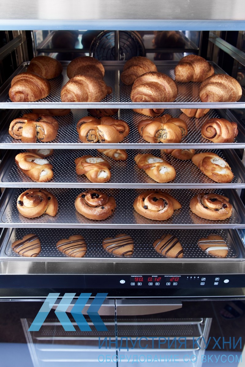 Дверь у печи стеклянная, чтобы вы могли наблюдать за процессом приготовления. Есть подсветка. Камера рассчитана на 6 противней размером 600х400 мм.