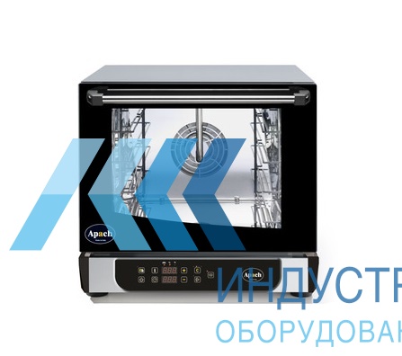 Печь имеет 4 уровня загрузки противнями размером 470х340 мм (GN 2/3). Расстояние между уровнями 80 мм. За счет нагревательных элементов и встроенных реверсивных вентиляторов, при работе печи Apach AD44D воздушный поток распределяется равномерно в камере, что благоприятно влияет на приготовление блюда. Уровень влажности устанавливается и регулируется вручную. Для готовки используются 99 программ по 3 этапа приготовления.