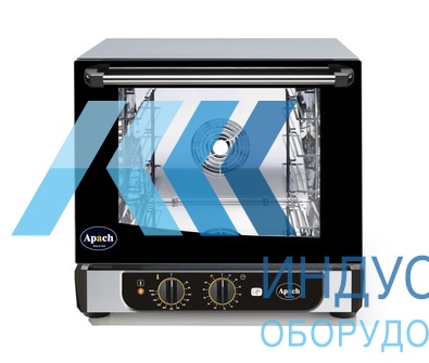Печь имеет 4 уровня загрузки противнями размером 450x340 мм. Расстояние между уровнями 75 мм. За счет нагревательных элементов и встроенных вентиляторов, при работе печи Apach AD44MH ECO воздушный поток распределяется равномерно в камере, что благоприятно влияет на приготовление блюда. У вентилятора одна скорость. Впрыск пара в камеру происходит после нажатия кнопки. Есть термостат, контролирующий уровень нагрева печи. С помощью регулятора выставляется время, необходимое для выбранной операции.