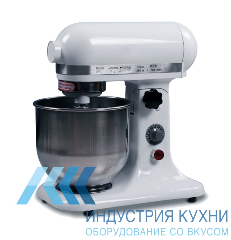 Дежа миксера объемом 7литров. Все части миксера, соприкасающиеся с продуктом, выполнены из нержавеющей стали. Предусмотрена плавная регулировка скорости.