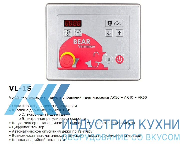 Панель управления обладает гладкой ровной поверхностью с утопленными кнопками и резиновыми уплотнениям для улучшения гигиены. Присутствует цифровой таймер (мин./сек.) для точного перемешивания.