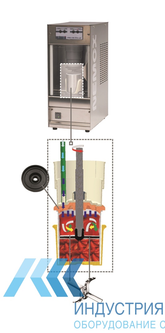 Схема работы прибора проста. Используются предварительно замороженные до -20С ингредиенты. Для заморозки их раскладывают в многоразовые мерные стаканы. У Frix Air имеется два цикла работы. Один длительностью две минуты, второй, ускоренный, - одну.
