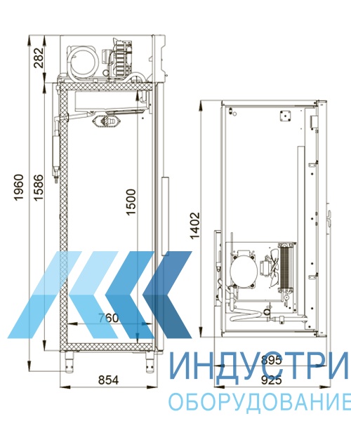 Быстрое и равномерное охлаждение происходит благодаря принудительной вентиляции внутри камеры. Продукты размещаются на 8 полках. Температурный диапазон холодильной камеры от 0 до +6С. Корпус холодильника обшит изнутри и снаружи нержавеющей сталью (кроме задней стенки). Толщина стенки корпуса 43 мм.