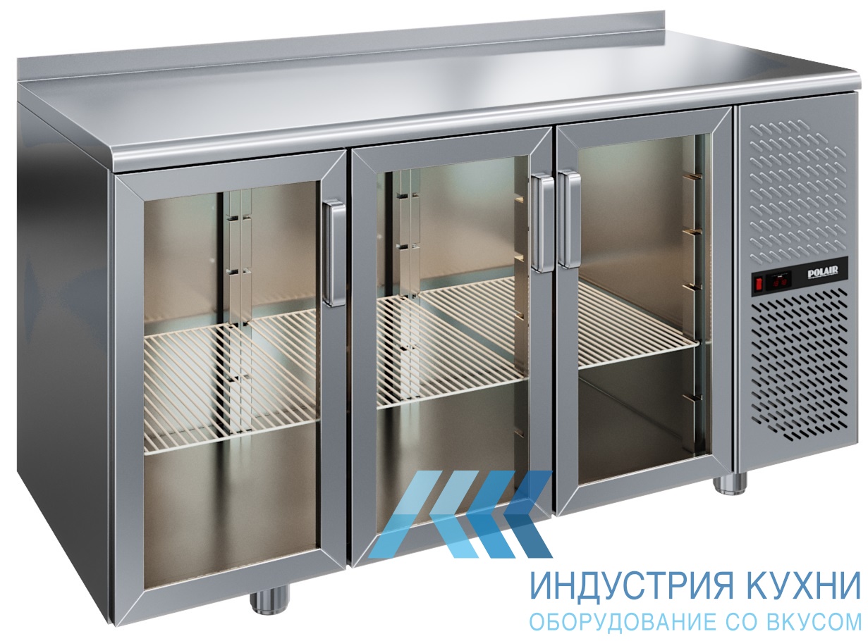 Линейка холодильных столов TD оборудована стеклянными дверями. Стеклопакеты в дверях заменяемые. Стекла обрамлены разборными алюминиевыми рамами. Ручки дверей эргономичные и удобные. Двери оборудованы эластичным уплотнителем с магнитной вставкой. В этой модели три отсека, закрывающиеся дверями. Внутренний объем подсвечивается светодиодной подсветкой.
