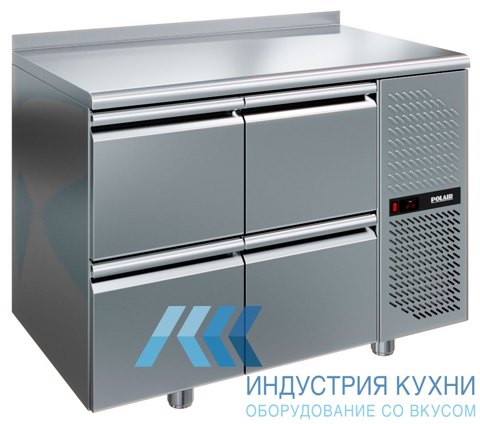 Толщина столешницы 40 мм, есть борт высотой 60 мм. Толщина стенкок корпуса 43 мм. Холодильный агрегат располагается сбоку. Для удобства обслуживания агрегат выдвигается с фронтальной стороны стола.