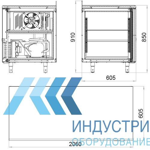 Толщина столешницы 40 мм, есть борт высотой 60 мм. Толщина стенкок корпуса 43 мм. Холодильный агрегат располагается сбоку. Для удобства обслуживания агрегат выдвигается с фронтальной стороны стола.