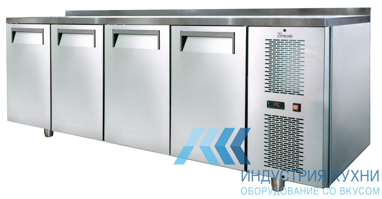 Толщина столешницы 40 мм, есть борт высотой 60 мм. Толщина стенкок корпуса 43 мм. Холодильный агрегат располагается сбоку. Для удобства обслуживания агрегат выдвигается с фронтальной стороны стола.