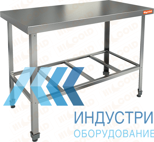 На полке-решетке хранят емкости большого размера. Стол сделан из разных металлов. Для столешницы и полки используется нержавеющая сталь AISI430 0,8 мм плюс усиление. Каркас в виде уголка из оцинкованного стали со сторонами шириной 40 мм и толщиной 8 мм. Борт отсутствует, поэтому изделие устанавливают и у стен, и посередине помещений. Опора — ножки.
