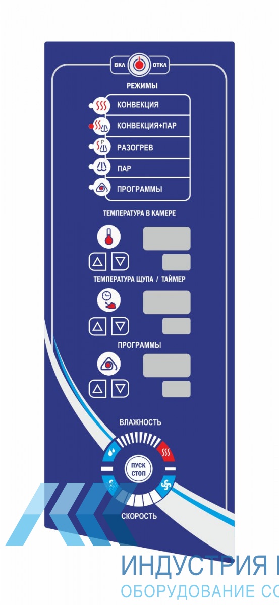 В дверце есть двойное термостойкое стекло, чтобы возможно было наблюдать за процессом приготовления. Конструкторы пароконвектомата подумали и о безопасности персонала. Двойное термостекло и двухходовой механизм открывания двери не дают персоналу получить ожоги. Внутренний объем освещается. Удобное и простое управление. Русифицированная мембранная панель находится спереди.