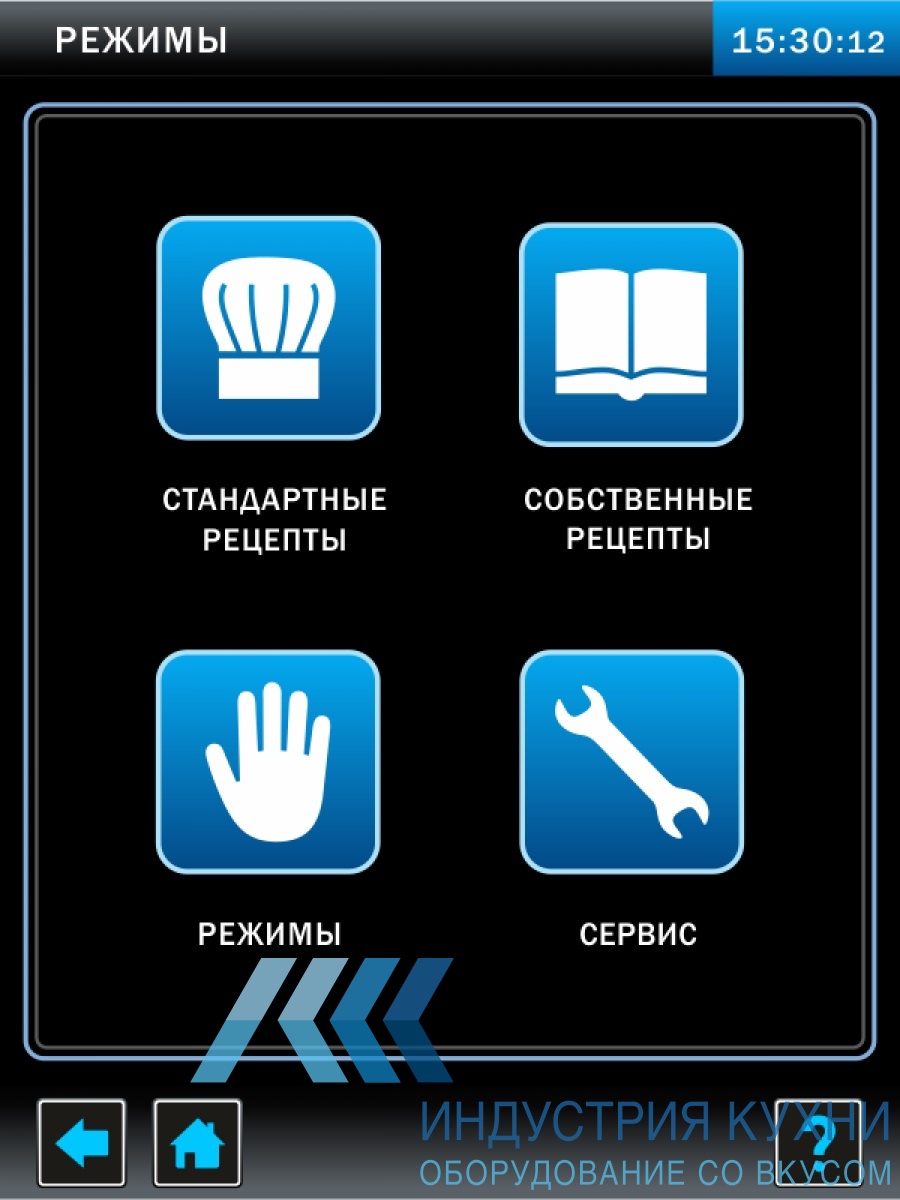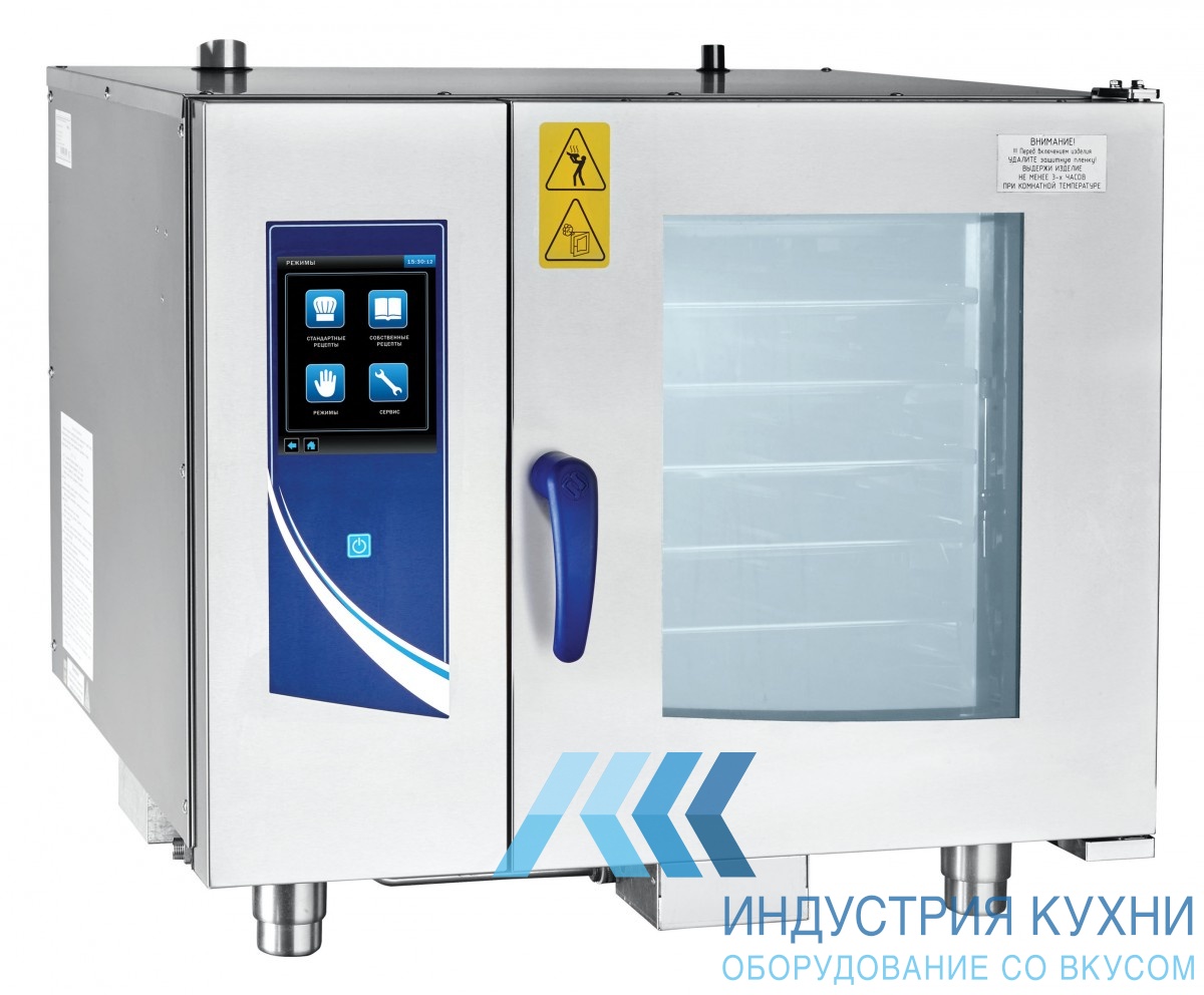 В дверце есть двойное термостойкое стекло, чтобы возможно было наблюдать за процессом приготовления. Конструкторы пароконвектомата подумали и о безопасности персонала. Двойное термостекло и двухходовой механизм открывания двери не дают персоналу получить ожоги . Внутренний объем освещается. Удобное и простое управление. Русифицированная сенсорная панель находится спереди.