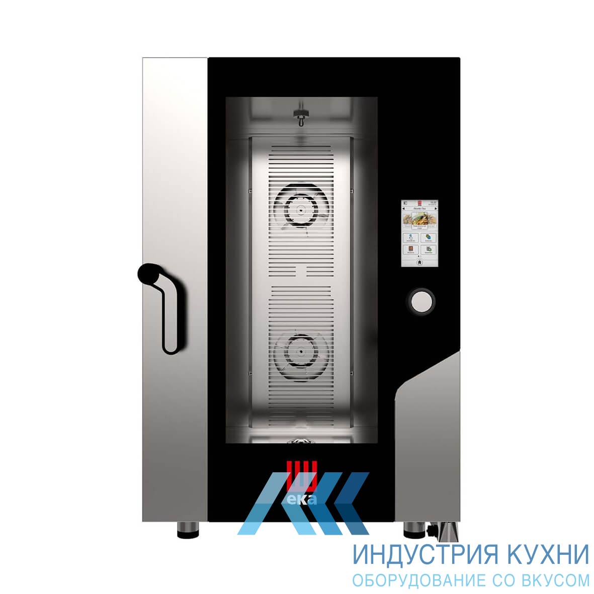 Пароконвектомат выполнен из нержавеющей стали. Внутренняя обшивка камеры также сделана из нержавейки, углы закруглены. Распашная дверца из двойного термостойкого стекла. Дверь фиксируется в четырех положениях от 30 до 180 градусов. Для наилучшего контроля процесса приготовления предусмотрена подсветка камеры. Тип пароувлажнения - инжекторный. Осуществляется прямой впрыск воды. Управление оборудованием осуществляется при помощи панели touch screen.
