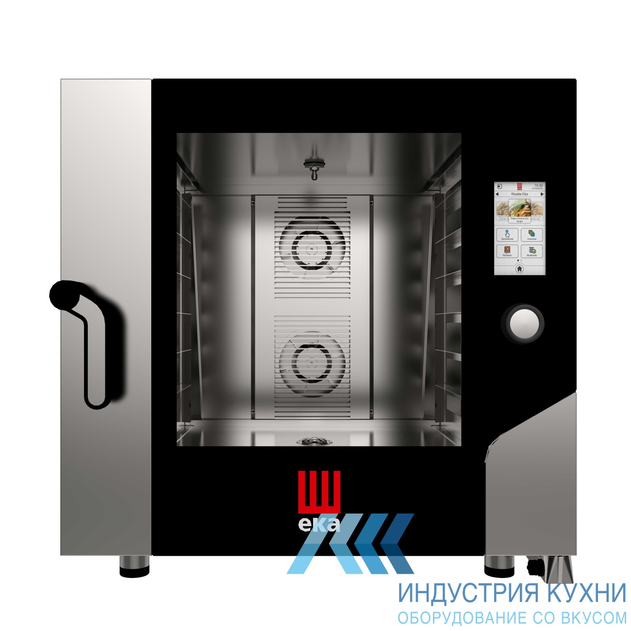 Пароконвектомат выполнен из нержавеющей стали. Внутренняя обшивка камеры также сделана из нержавейки, углы закруглены. Распашная дверца из двойного термостойкого стекла. Дверь фиксируется в четырех положениях от 30 до 180 градусов. Для наилучшего контроля процесса приготовления предусмотрена подсветка камеры. Тип пароувлажнения - инжекторный. Осуществляется прямой впрыск воды. Управление оборудованием осуществляется при помощи панели touch screen.