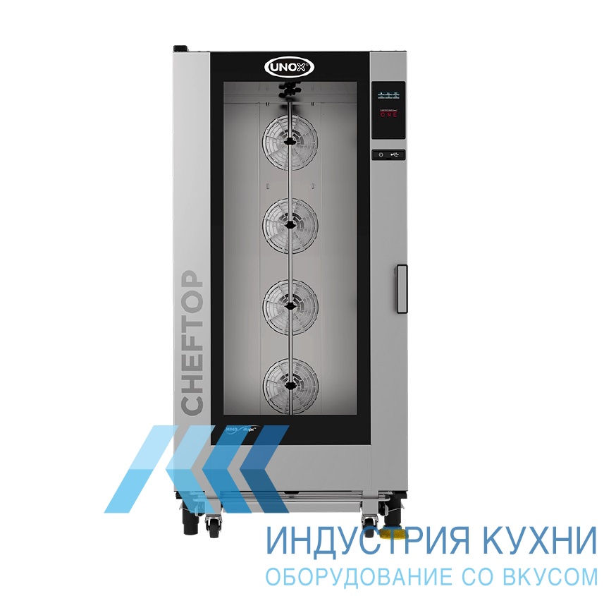 Направляющие сделаны под гастроемкости. Уровень влажности в камере программируется. Можно выбрать как стандартную программу выпечки с высокой влажностью, сухой выпечки, так и установить параметры влажности самостоятельно. Установлены 2-х скоростные вентиляторы с реверсивным движением.