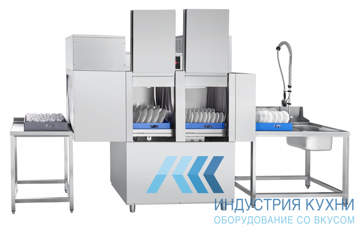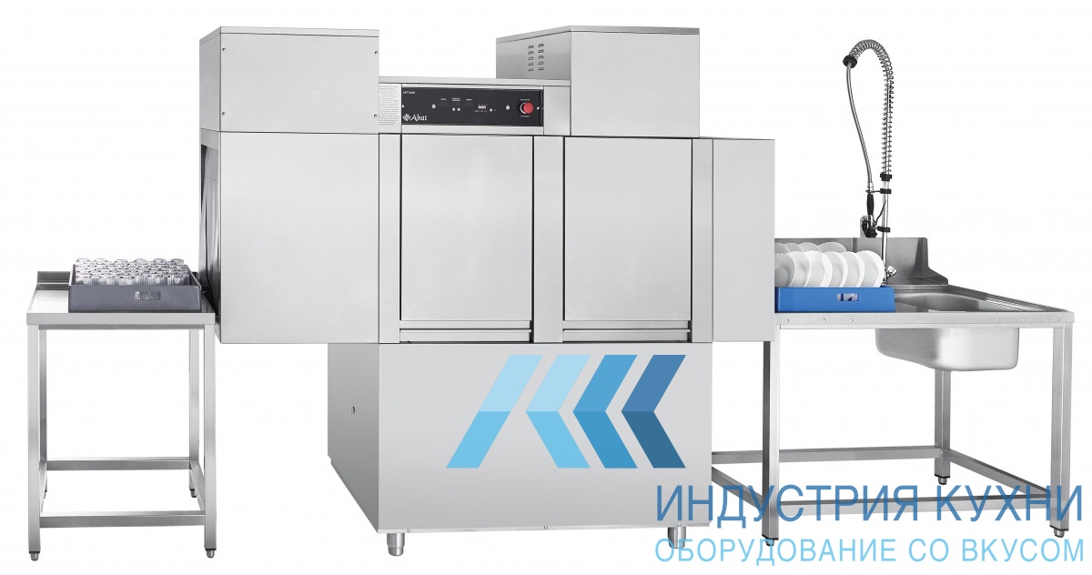 Туннельная посудомоечная машина Abat МПТ-2000 (левая) с теплообменником используется для мытья тарелок, суповых мисок, стаканов, приборов, чашек, подносов размером не более 530х325мм на предприятиях общественного питания, имеющих холодное и горячее водоснабжение с применением жидкого ополаскивающего и моющего средства. Камера посудомоечной машины разделена на секцию мойки, секцию ополаскивания и секцию сушки. Производительность машины составляет 111 кассет в час (1998 тарелок в час). Используются кассеты 500х500 мм. В кассету единовременно загружают не более 18 тарелок, 36 стаканов и 140 столовых приборов. Возможно мытье гастроемкостей формата GN 1/1, 2/3, 2/4, 2/8, 1/2, 1/3, 1/4, 1/6, 1/9. Для емкостей формата GN 1/1, 2/4* нужно приобрести специальную кассету.