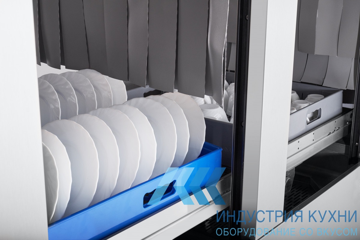 Загрузка кассеты происходит слева, движется она слева направо. Туннельная машина способна легко справляться с большим потоком посуды.